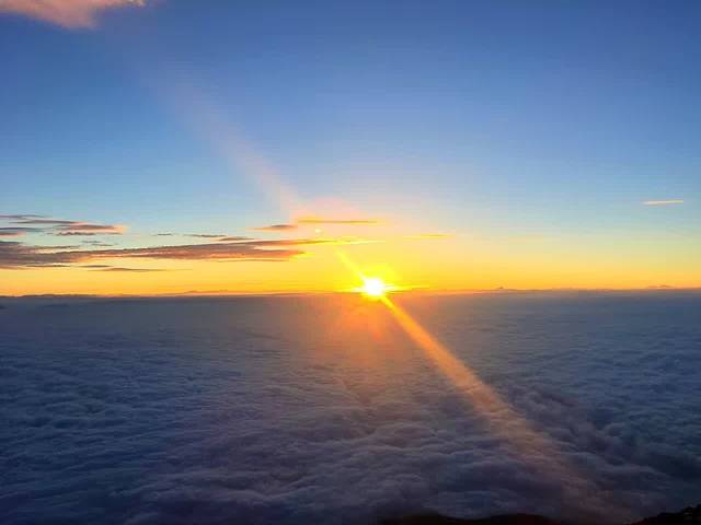这时因为山上有了光亮,所以山上的风景也开始变美,我们很幸运的是一路上没有遇到雨水,所以天空也一片晴朗,但也有可能是因为我们已经在云层之上的原因