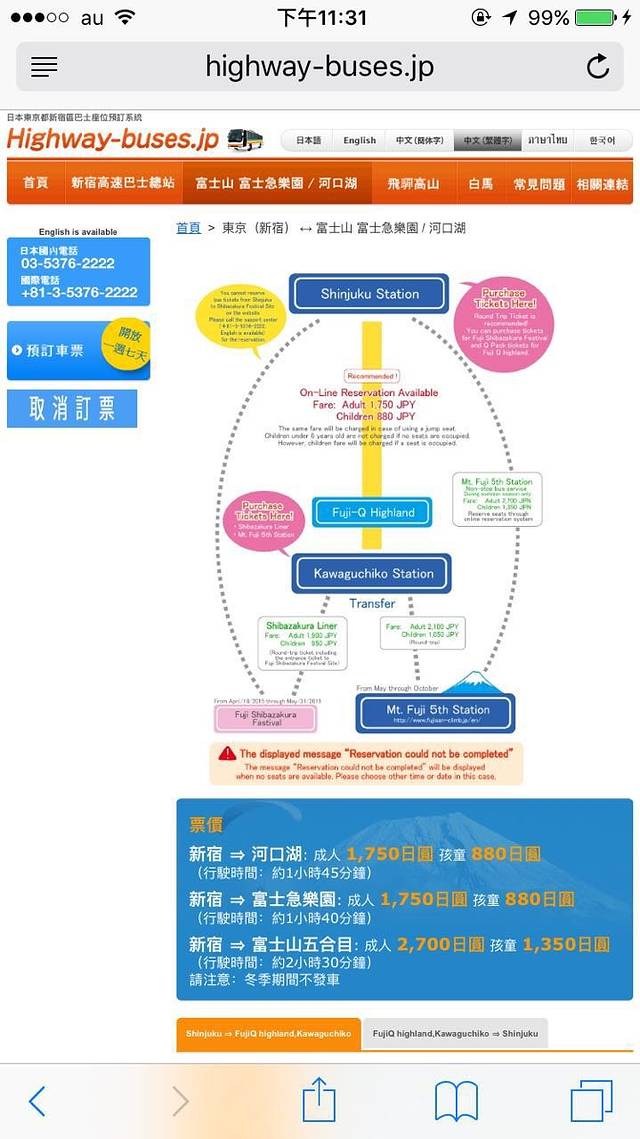 东京→河口湖 (新宿高速巴士)网上可订,图上有网址,往返会便宜,没信用卡可到便利店扫码付款,时间大概两个小时,不过遇到堵车或者天气原因延迟是很正常的~