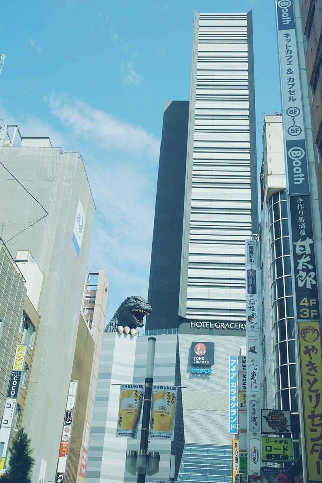 酒店附近是个电影院,屋顶有只哥斯