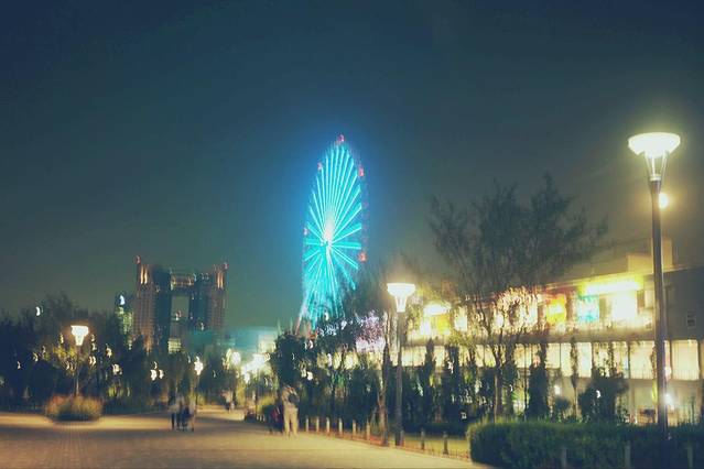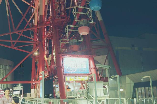 到达目的地台场海滨公园。远方的彩虹大桥