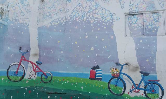 就跟村的名字一样,一个村其实不大,全在山坡上,各家各户的外墙上画满了各种画,有童真的、有浪漫的,反正应有尽有,使整个小村庄变成艺术的海洋,并与周围的环境相得益彰。
