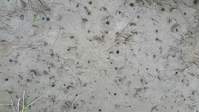 再沿着小道走,在芦苇稍微稀疏一点两边,能看到无数的螃蟹在横行霸道,也能看到长得像泥鳅似的弹涂鱼。