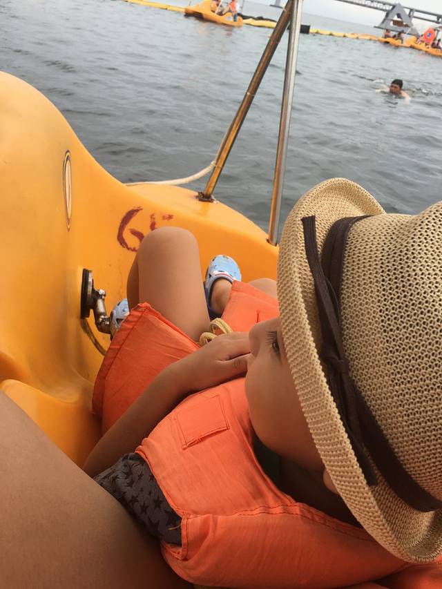 图图喜欢划船,选了脚蹬的,图图非要蹬,他又够不着,全程图爸自己蹬,我抱着图图,腿没地方放起,要抽筋了