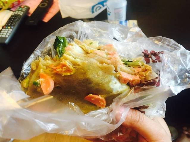 早上叫的外卖,煎饼果子特别乱,里面有生菜和火腿,各种夹
