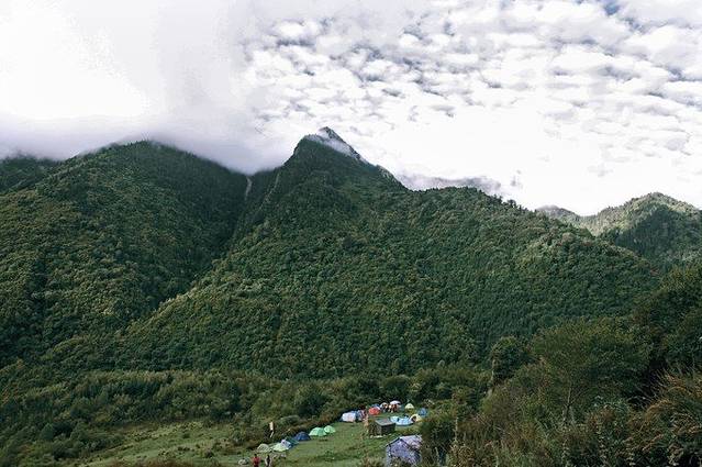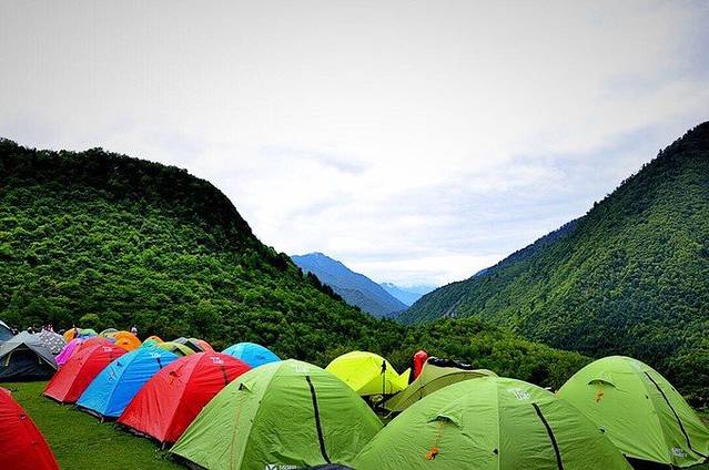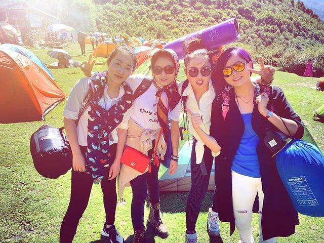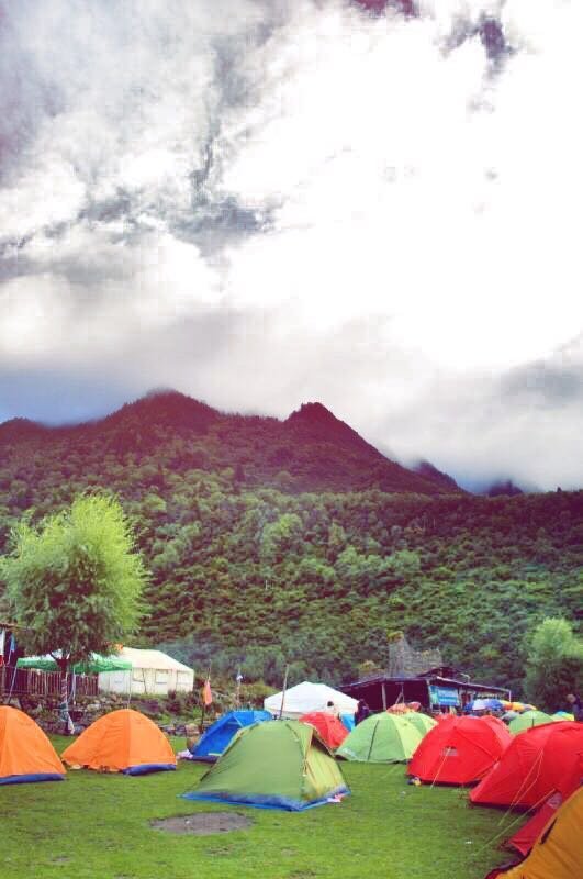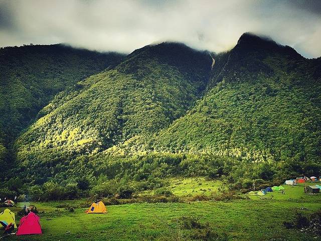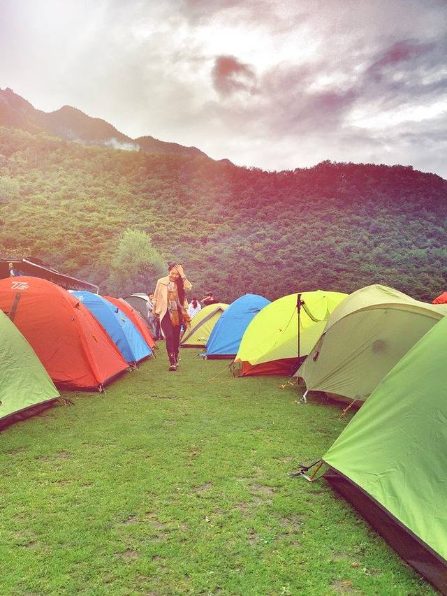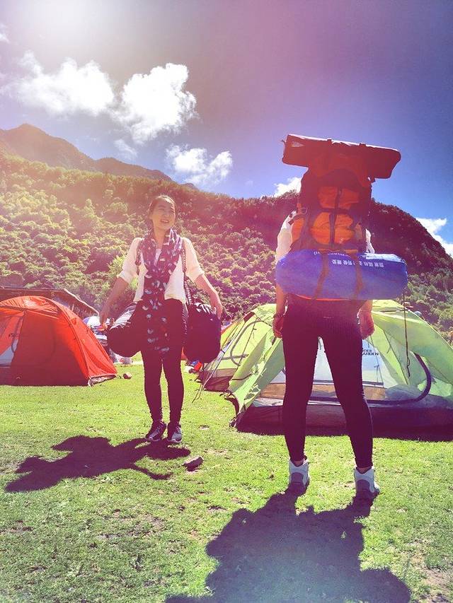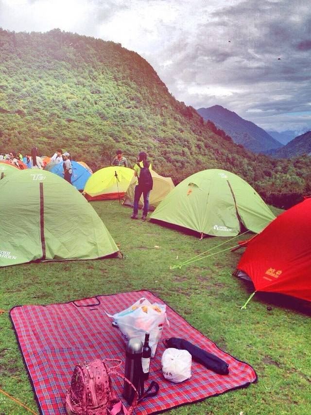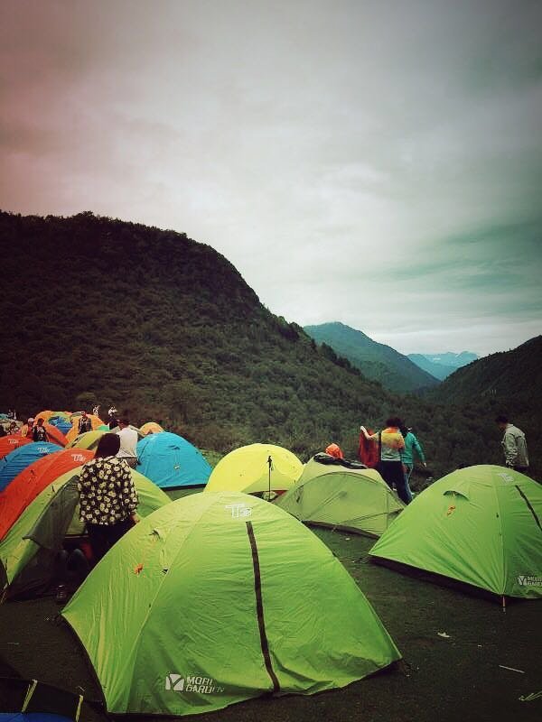 之前一直在担心露营不太安全,因为我们队友里只有一名没有八块腹肌的男生,爬到目的地的时候,我们看到了一大片帐篷,哇,找到组织的感觉,心里踏实得哦。四周环山,中间低凹处便是一层一层的平地,特别适合露营。