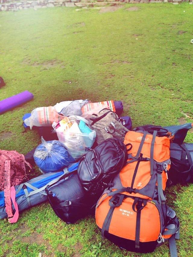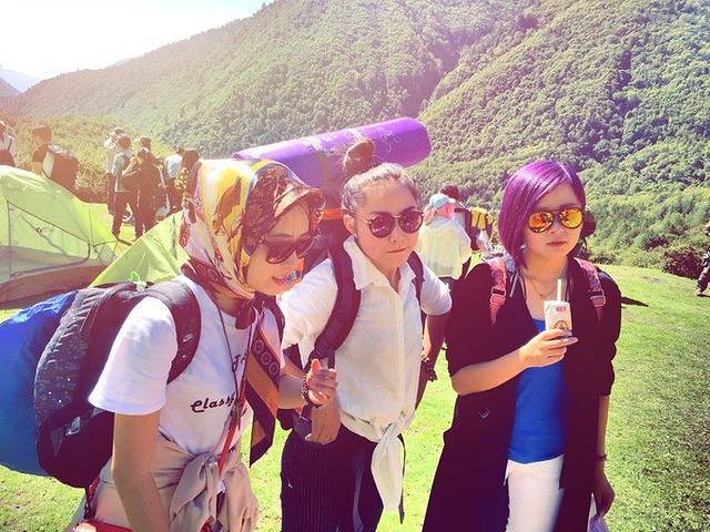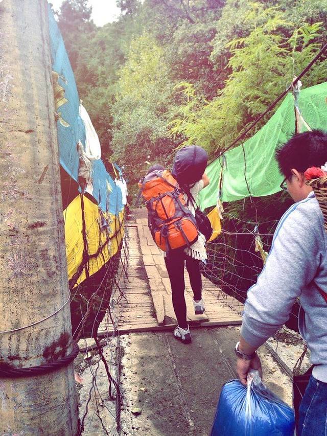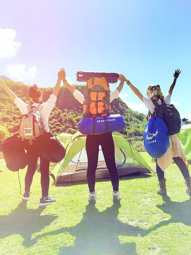 不能免俗的事情当然逃不过在旅途中依然放肆的玩着手机,鄙视一下这两个小孩,当然还有我自己 呵呵。经过了三个多小时的车程,终于到达孟屯,上孟乡 下孟乡 转悠了一圈,终于还是在尼玛部落店里的友好姐姐给了我们指示,外加一张景区地图,我们锁定了目的地。我们首先要去体验的就是高桥沟的露营,虽然我们被那些徒步旅行的人称作腐败游,但其实我们就是一种接地气的户外体验。我们的车开到山下就到头了,接下来的路只能爬上去了,还得把我们所有要用的东西,比如帐篷,还有我们购买的一大包零食,还有廖记,哈哈。于是分工之后我们各自背上了各自可以承受的重量的物品。对于平日里每天运动步数在5000-7000步的人来讲,背着背包爬山会是一种什么样的体验,虚弱啊……走几步就遇到往返的其他露营的人,一直不停的问,前面还要走久啊?“快到了” 哈哈 真好 “还有三分之二” 呃呃……逗我啊。欢欢和林主背的东西比我们要多很多,但是她们却走到了最前面,能者确实会被多劳这句话我说出来会不会被打啊?