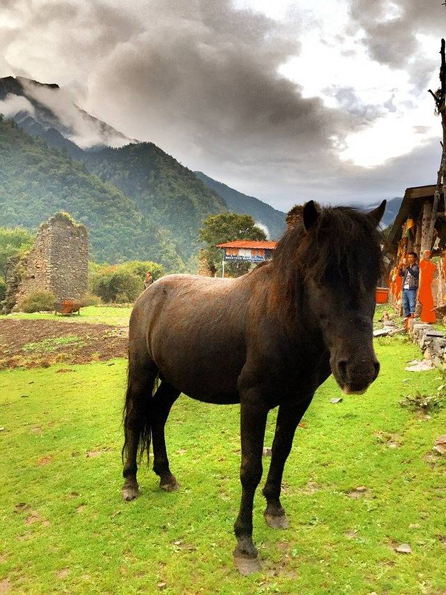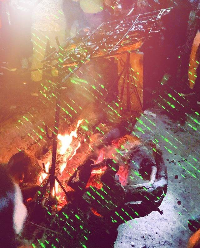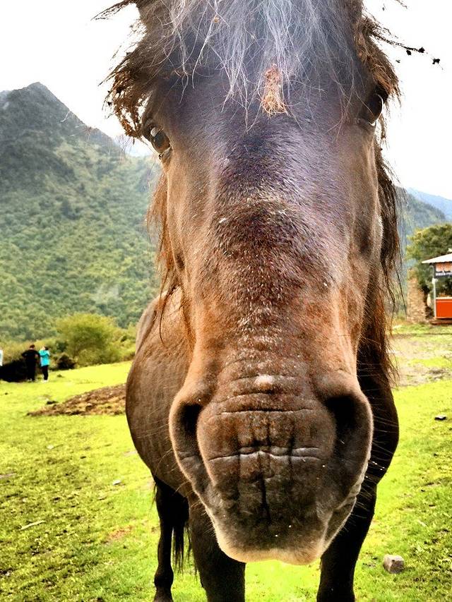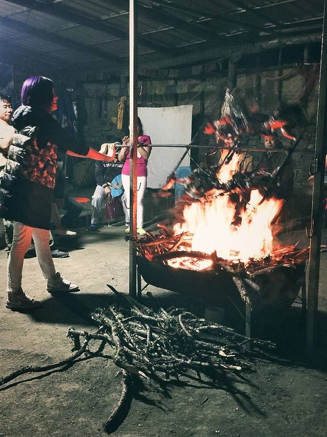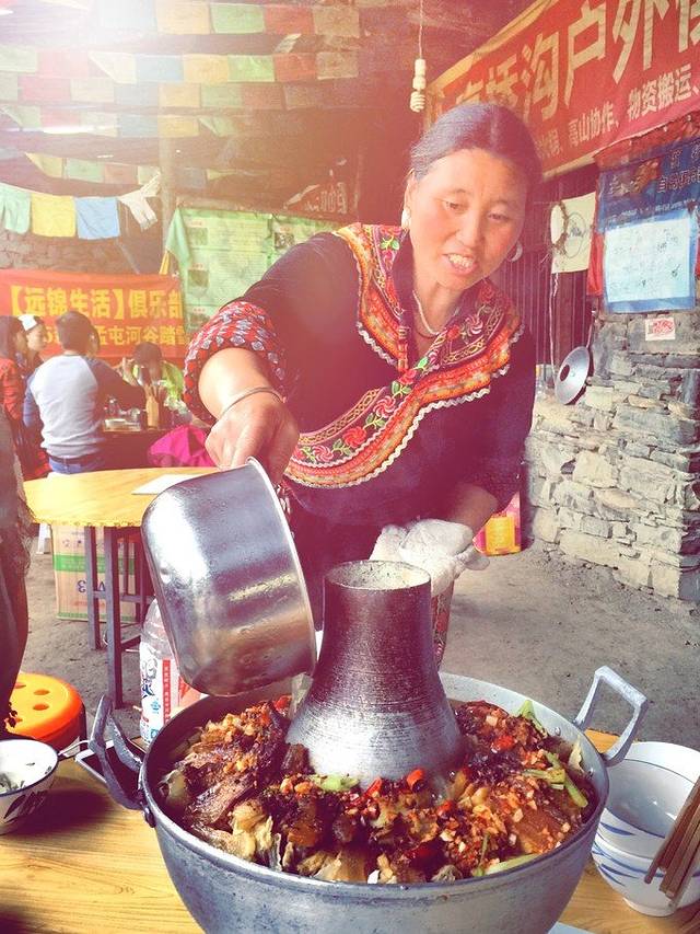 晚餐尼玛部落的藏式火锅,很正宗的自家羊肉哦,内容丰富,里面有蕨苔、刺笼包、羌活花、飘带葱、老腊肉、山羊肉、野生蔬菜等,然后再配上我们自带的红酒和竹叶青茶,混搭口味,那可是美美的哦。吃得正美味的时候突然看见一匹小马,哇塞,激动得我马上放下筷子冲出去,拍拍拍,虽然它满脸的马粪,但是丝毫不减它受欢迎的程度,萌萌哒。晚饭后,几处都开始了各自的篝火晚会,各自音乐交织,广场舞音乐+动感十足的舞曲,我们当然走向了动感舞曲啦,因为在这种原始部落里,能有闪耀的光效,那是无比的稀奇啊!走近一看,哈哈,是大家各自拿出了手电筒,围着烤全羊的篝火起舞,低调的我们也在旁边凑了凑热闹,老板很奔放啊,画面太美,不好意思描述,感兴趣的自己去体验。大姐 也去体验了一下烤肉,看她玩得很开心的样子,哈哈。