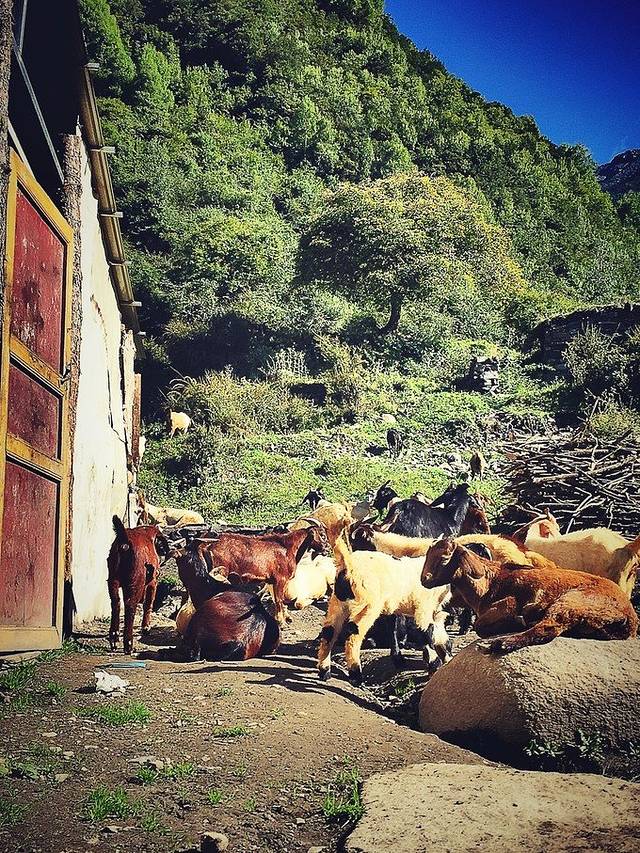 早上6点,天空慢慢亮起来,我们也被外面一阵一阵的惊叹声吵醒,于是我们也就裹着睡袋这样看着阳光一点一点地把雾气驱散,温度也一点一点地上升。起床时穿了两件厚外套加羽绒背心,一会儿我就只能穿短袖了……于是我还变成了买鸡蛋的小妹。正在享受阳光时,发现一群山羊跑到我们的帐篷旁边来吃我们的食物,一阵驱赶,它们便慢悠悠的走开了。样子也是萌萌哒。