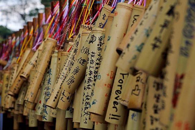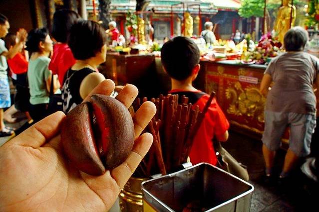 有事要请教神明时,需要用到一种名为“筊”特别的工具。这种工具两块为一组,大约是掌心大小,漆成朱红色,呈弯月形状,具有弯弯的曲线和圆弧的隆起,上方是隆起的圆弧,下方是平的,两块底部可以紧密贴合。所以,通常寺庙的供奉台旁边会提供签桶,还有一个桶放着很多筊,供信客掷筊使用。