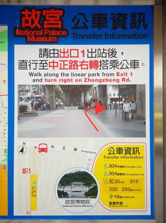 今天和一个在民宿认识的大陆交换生一起去故宫玩,在捷运站办了一张两日的「TaipeiPass台北观光护照卡」,在两天内可凭这张卡无限次搭乘台北捷运站和公车。一出捷运站就有一块“公车资讯”立在门口,指引路人搭乘公车,非常贴心。
