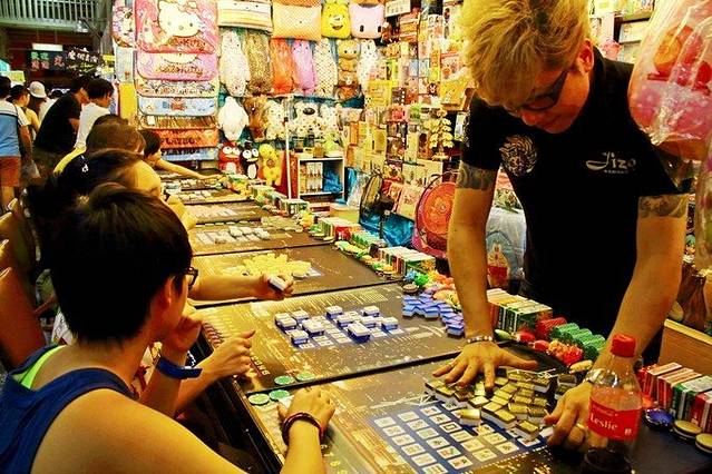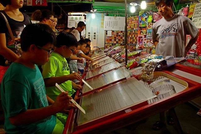 这个游戏叫“麻将宾果”,在6*6矩阵里,任取15张牌排入矩阵中,至少有一连线即可中奖。若结果还缺一格才连成线,则为听牌状态,可再取三张牌,若有抽中缺格那张,也视作中奖~趣味性很强,在各大夜市基本都能见到它的身影。