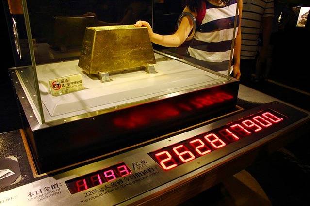 在博物馆的出口处终于看到此行的终极目标了:镇馆之宝——重达220公斤的纯金金砖!巨型金砖被玻璃罩罩起来了,但很人性化地在两边留了两个洞。大家都在排队摸那个超大金块, 沾沾财运,拍照留念。我也不例外哈哈~