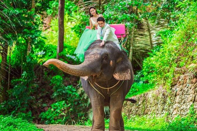 化妆师在给我补妆的时候,旁边有这只小象,甚是调皮,可爱,还会装死呢,弄得我一点拍照的心情都没有了,老想去他跟前。化妆师对熊孩子说,快去给他拍几张,不然婚纱照都拍不成了 大象却是真乖的,很听训像师的话,估计是怕挨打吧。
