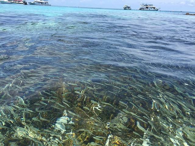 皇帝岛的水很清澈,人也没有珊瑚岛的多,躺在椰树下睡一觉还是很舒服的,熊孩子还不是很舒服,在睡,我就只有自己玩了。水里那黑压压的一片片其实是成群结队的鱼儿。