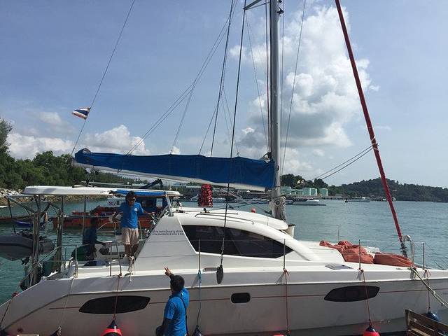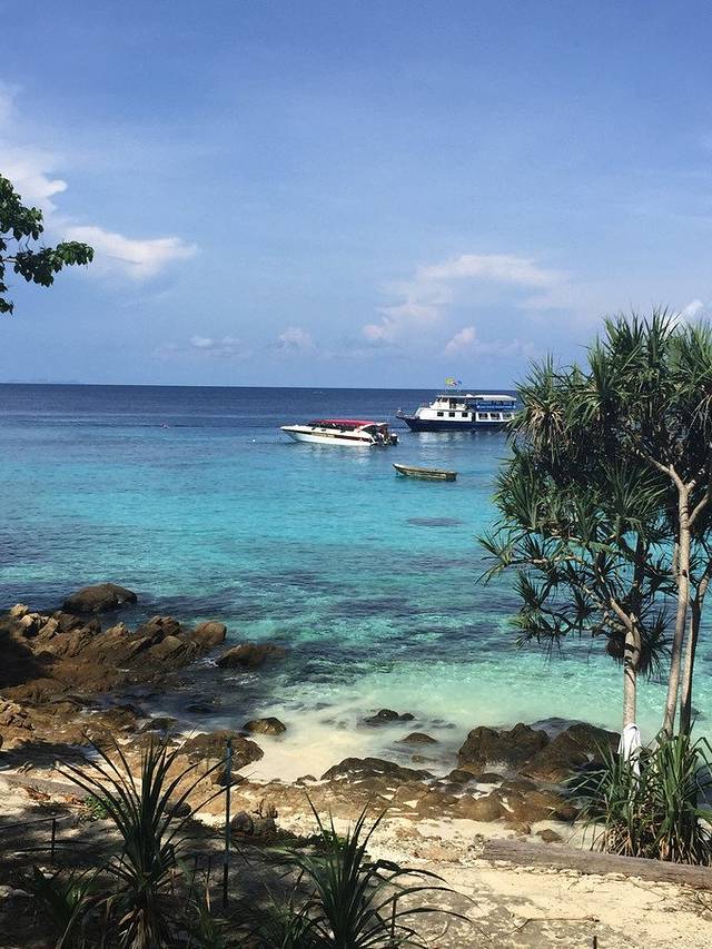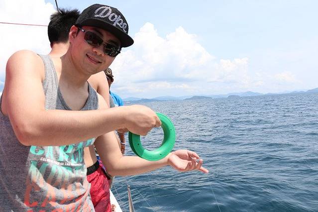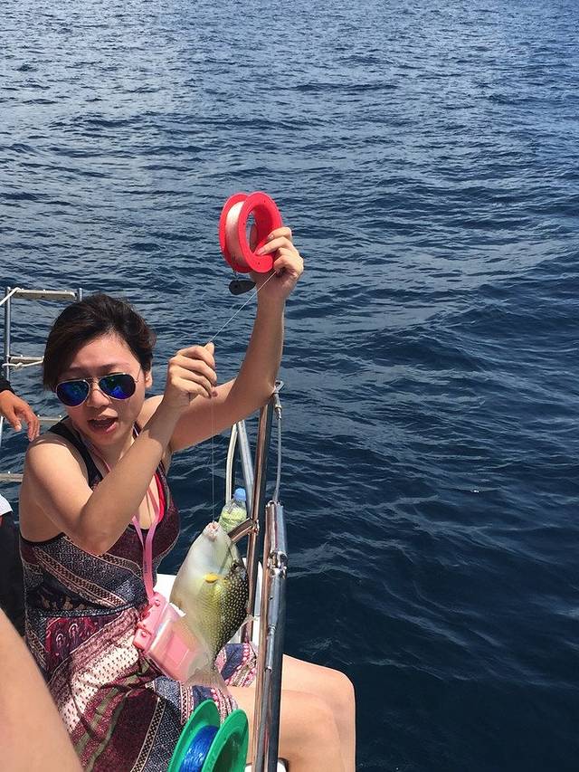 船帆被降下,我们的游艇降低了速度,导游给大家发了钓鱼的工具,大家都来到的甲板上海钓。我其实挺怀疑能不能钓到鱼,或者钓上来的鱼能不能吃。导游告诉我们泰国人民对海域保护的意识很强,并不允许船只肆意的在海上航行或者捕捞,为的就是保护养育他们的大海和海洋生物。怪不得这里连海边的水都是清澈见底的呢。伙计们可要加油啊,指着你们吃生鱼片呢