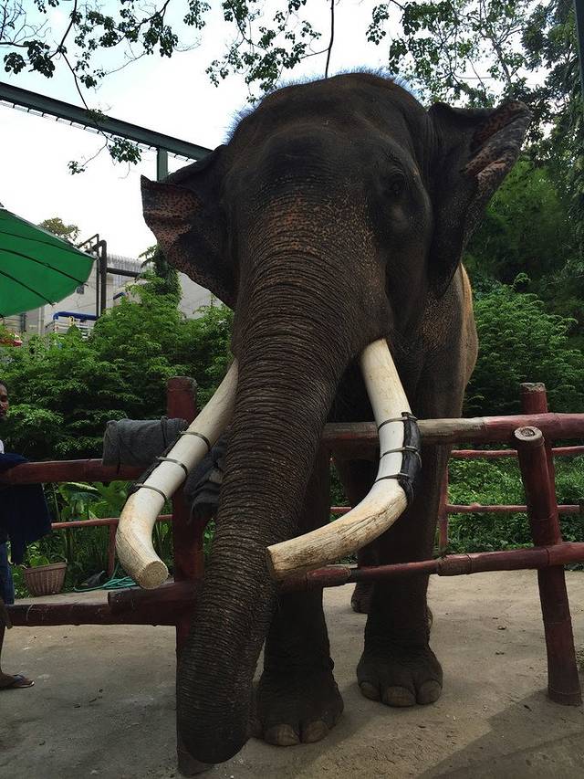 个头可真大,这一天得吃多少才行。主人也很聪明,让游客买食物来喂他,既带来了乐趣,也赢了利,而且他的象也不用挨饿。