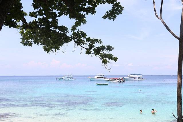 在珊瑚岛歇了会,就来到了皇帝岛,先是吃饭,这自助跟昨天的也没法比熊孩子没胃口,我也没怎么吃,就在椰树下找个凳子歇会儿。浮潜也没去,熊孩子不舒服,不忍心留他一个人。