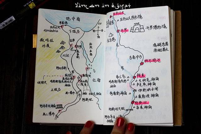 左边一页是简略版埃及地图,右边一页是这次旅行的行程路线图。