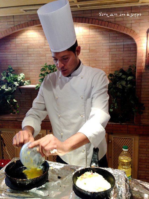 换件衣服直奔餐厅,煎鸡蛋饼的帅哥大厨面前总是排了很多人,等了半天才吃上。