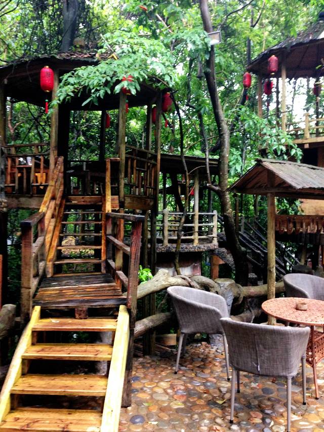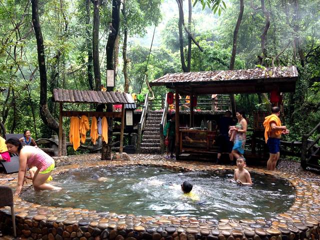 爬山累了可以去树上温泉泡去一天的劳累,那树上温泉可不是真正的建在树上的,只是周围有一些高大的树木 用水泥石块砌成的池子。树上温泉药浴的药材选自这座大山中的原始森林,没有任何污染,在树林下泡着温泉 空气又干净 一身的劳累很快就消失了,温泉旁边还有凉茶 滚汤的热姜水