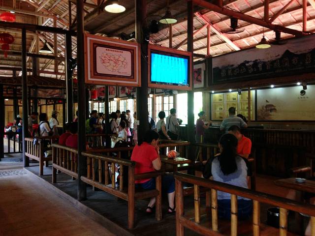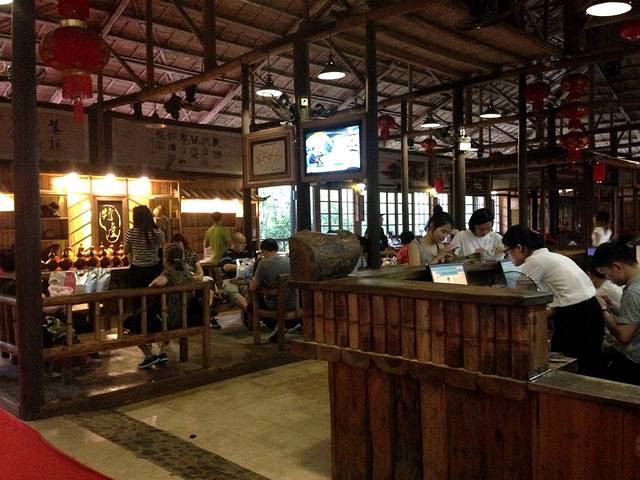 复古的建筑风格,挂着红灯笼,休息区摆着不少椅子,