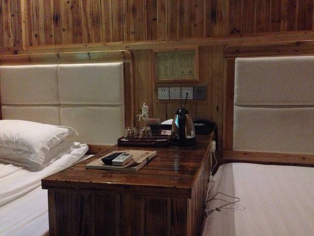两张床关排,虽床不是很大,一个人睡也够了 地面木板清洁干净,(客房)