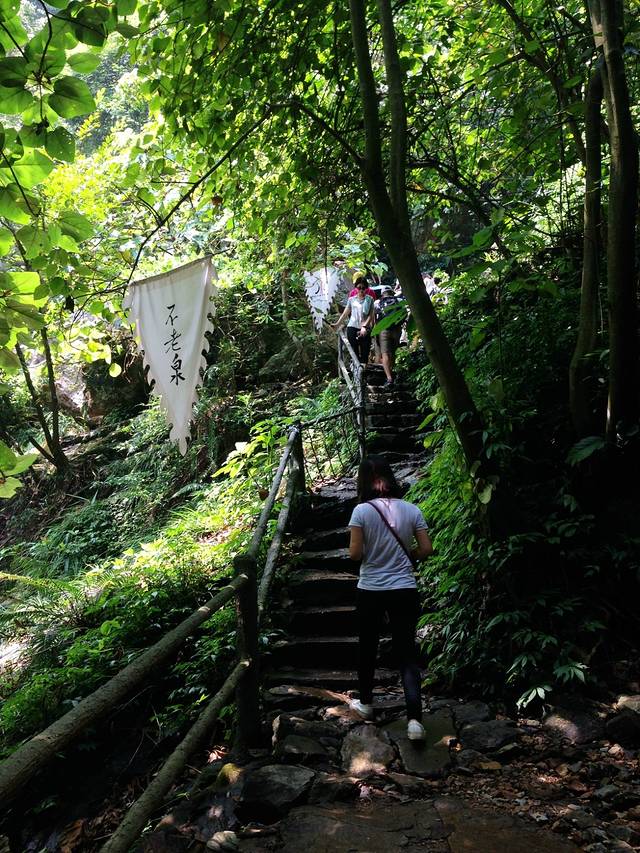 午饭后,进入天门沟一条长长的栈道,带着神秘向着深谷处延伸,石板铺就的小径承载着许多行人的脚印,斑驳的阳光落在层叠的垒石上,海拔320米处,岩体上有一眼泉破壁而出,无论久旱或洪涝,其量、其温、其透明度始终保持不变;更为奇特的是,泉水久置如新,终年不老,故名“不老泉”。井底清潭中嬉水玩乐的小孩,一潭清澈见底的水池,水冲击着巨大的石块,冒起朵朵雪白的水花。