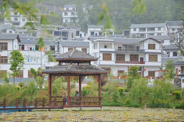 一排排灰瓦白墙的房屋依山而建,层次分明,倒映在村子前面的池塘里,而池塘里的荷花含苞待放。洁净的溪水、干净整洁的村容村貌、错落有致的建筑给人留下深刻的印象。