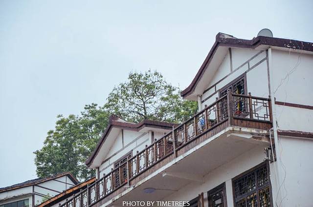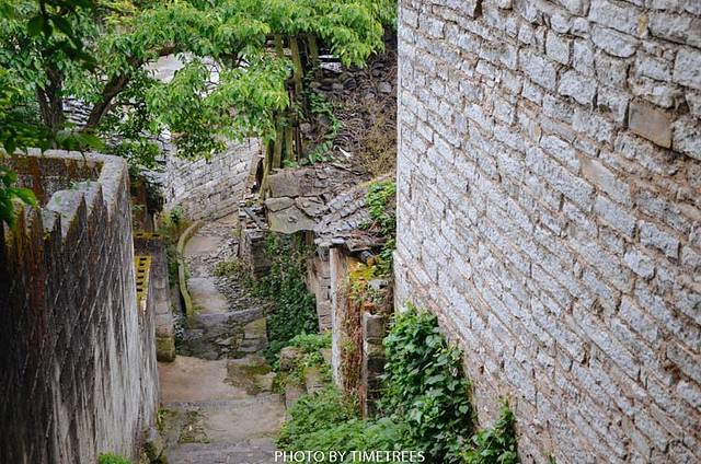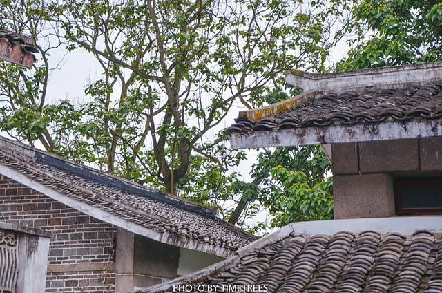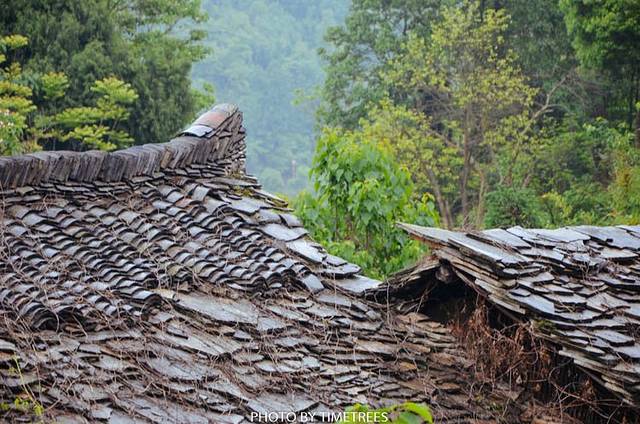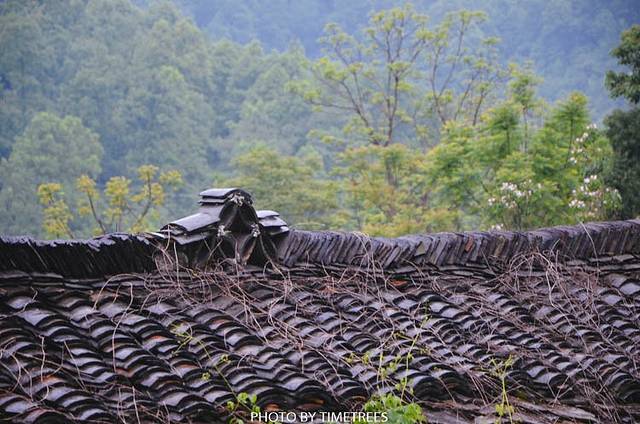 望四周望去还会看到残旧的木窗,还有远处屋顶整齐如鳞的瓦片。迂回曲折的小道、高低起伏的坡坎,掩映在葱郁的植被中间,石头的灰黑色与植物的翠绿相互映衬,质朴而自然。