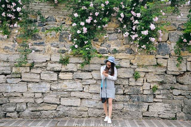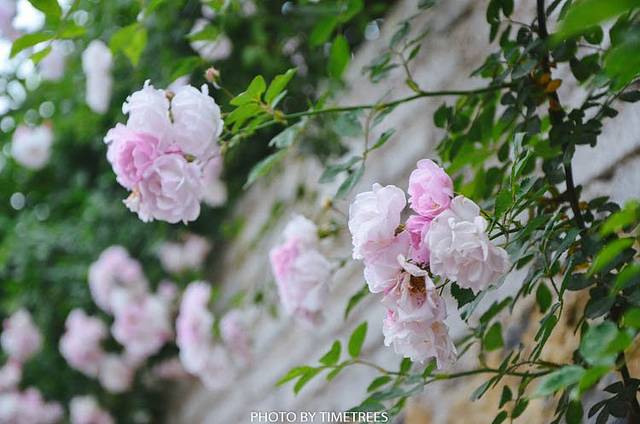 墙上还开满了粉红的花朵,让原本普通的石墙一下变成了大家喜爱的背景。