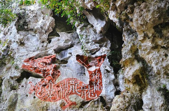 在路上,会看到一个类似图腾符号的雕刻,一条巨龙在岩壁上腾越,龙头龙尾都是天生,只有龙身由9个不同书体的龙字组成,从中国最古老的象形文字到书圣王羲之的草书,隐约包含着中国源远流长的龙文化之意。