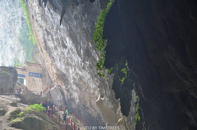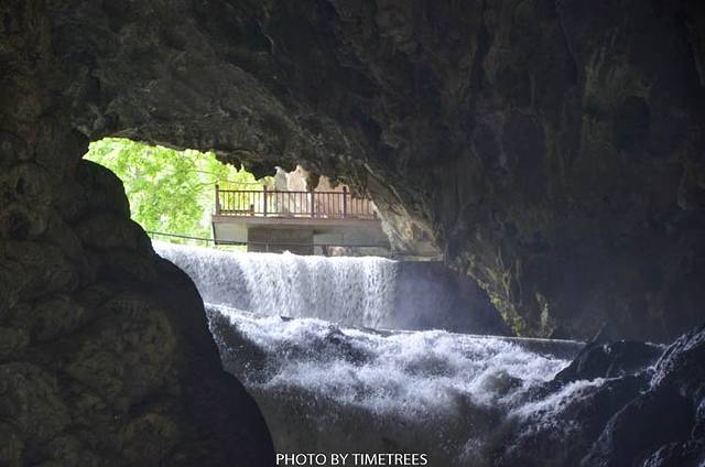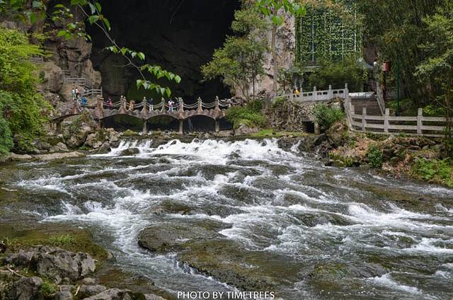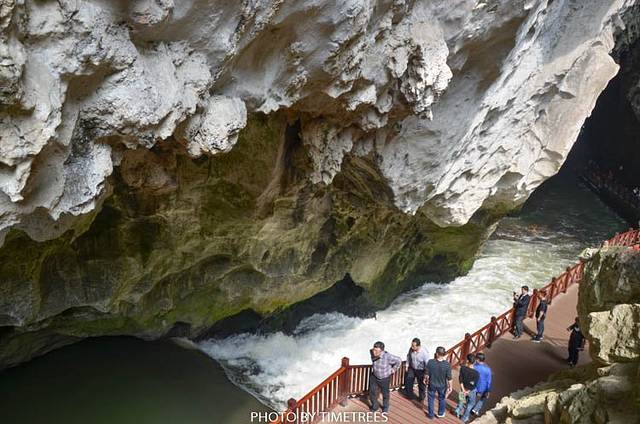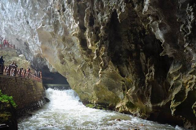 在不远处就听到哗哗的流水声,从枝叶间往外看去发现水流变得湍急了,拐过一个弯你会惊讶的发现有一个巨大的洞口,两旁的石钟乳好像獠牙,酷似一头张开血盆大口的巨龙。