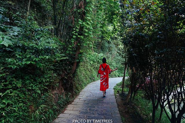 我们逆水而行,走在石径上,两旁树木葱郁,显得十分幽静。