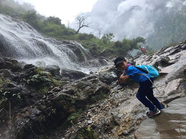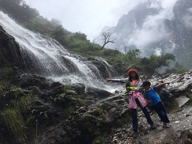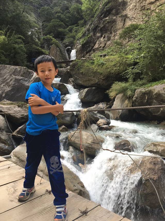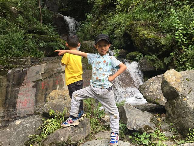 下午3点,走得比较累的时候,遇见小瀑布,小盆友好开心(第二天才知道后面瀑布更多,更美)。