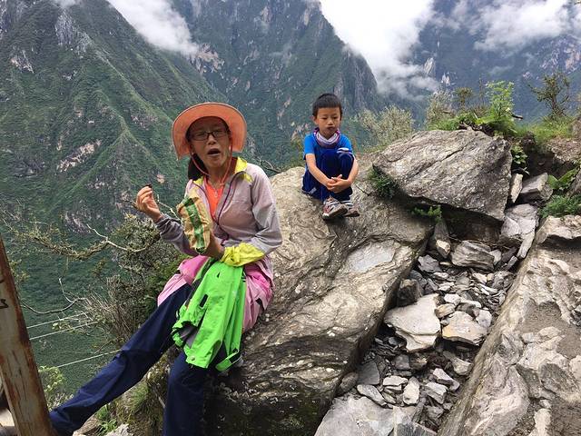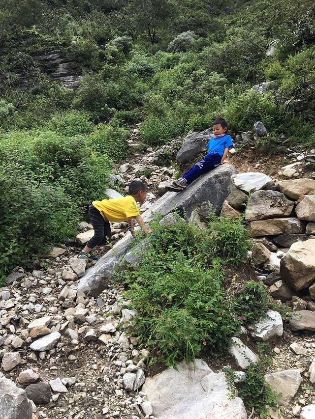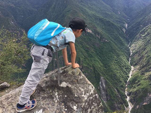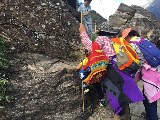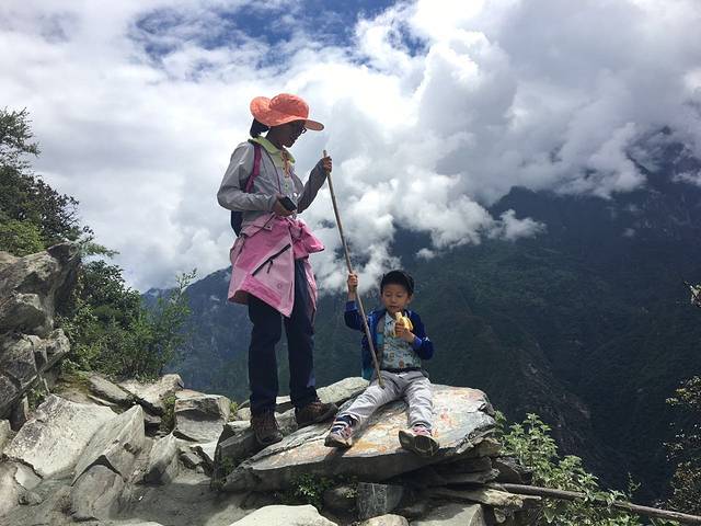 但是副队长不想走了,妈妈们也不想走了,好吧,包由妈妈看着,轻装上阵,继续下行到虎跳石,见见老虎。