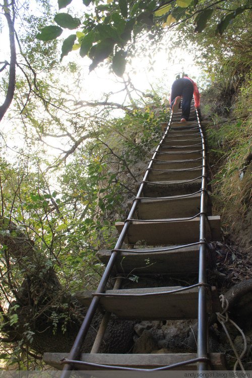 上到半山腰,看到了大天梯,我觉得还是算了,太陡,太高,但是小队长说不走这个就不上去,我的天,管不了你了是吧。