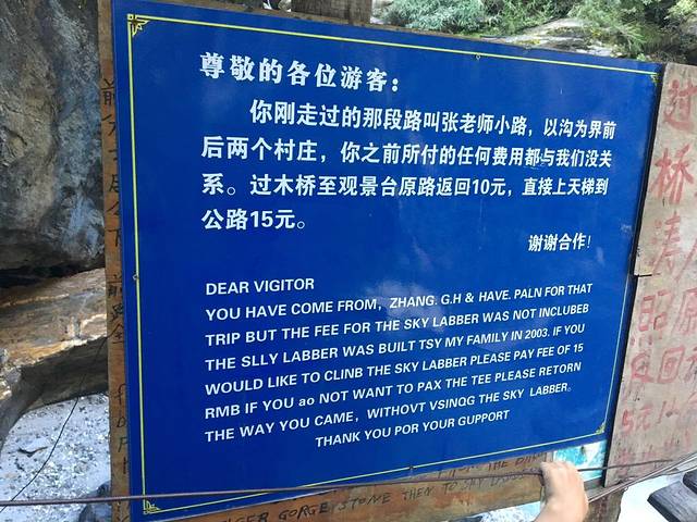 张老师虎跳石和天梯虎跳石之间有一条路连通,从张老师向天梯客栈方向通过,需要付费10元。不过也下班了,没人管了。