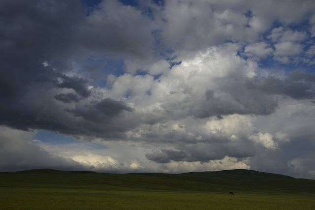 变化无常的草原上,远处一只马在悠闲地吃草,无视身边的变化。它才是这片土地真正的主人。