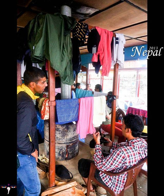 这种天气,每个客栈的屋子中间有一个巨大的火炉,大家都围座在边上烤湿衣服和取暖。炉子边的架子像『联合国升旗』, T 恤、裤子、袜子之类的东西,统统烤之。