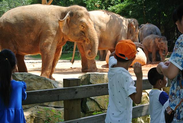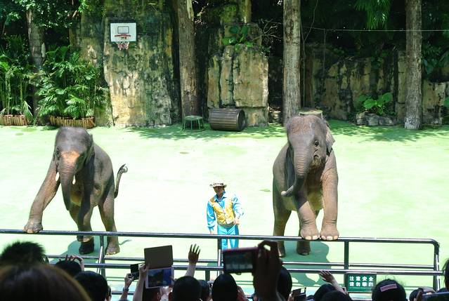 剧场出门后右转就是“亚洲大象”园区,花15元买串香蕉投食给大象们,还可以近距离观看大象是怎么用鼻子抓食物吃的,挺好玩。