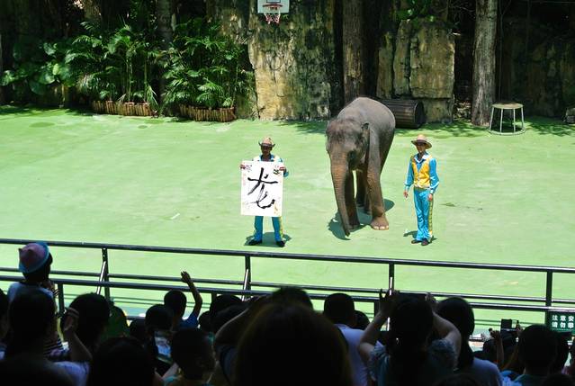会写字的大象,这个字是要拍卖的,50元起价,价高者得,还能与大象合影。我观看的这场卖到了260元,看来有钱人还是不少的。