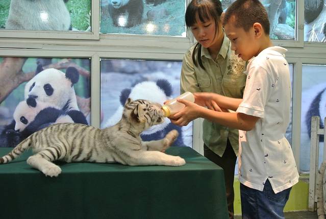 在熊猫商店里居然有头“白虎宝宝”,可以花30元给小老虎喂奶拍照