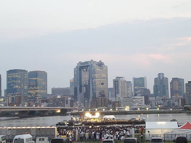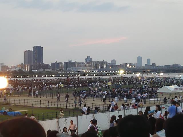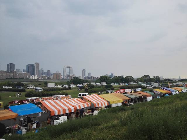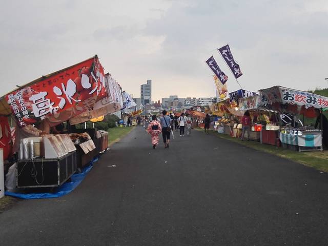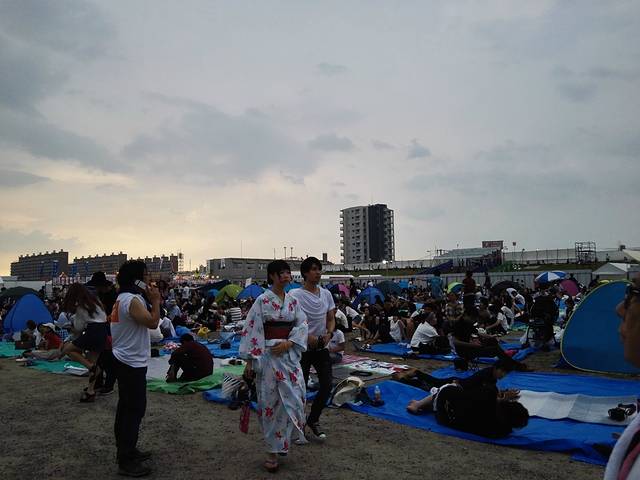 还好今天天公比较给力,四点多钟时已经是凉爽的多云天气,前几天那可是35℃一直持续到晚上七点。我们慢慢走去花火大会会场,感觉这真是当地人的一项盛事呢,很多人穿上了和服,河边也早早支起了各种摊点。尽管我们提前了三个小时出发,人已经到了很多了。