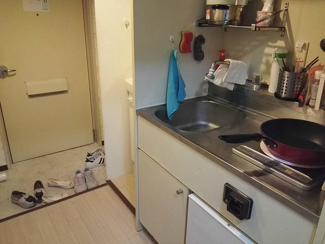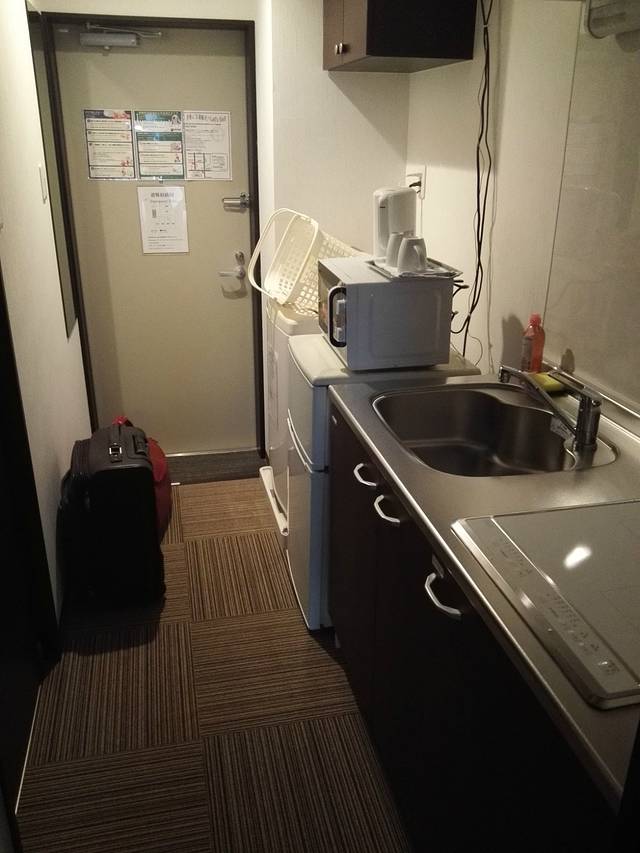 上午拖着行李赶去大阪市区的民宿,日本的地铁一直通到像泉佐野这样的大城市周边的小镇上,还是很方便的。不过在日本转地铁好像是件麻烦事,这个完全是我同事在操心,我只管跟着她走,模模糊糊觉得就在上上下下,而且有的长线还分普通和快速,快速车好多小站是不停的。不过一旦进入大阪市区地界,大阪1日游通票就可以派上用场了。 我们住的地方在大阪扇町公园附近,其实就是一处住宅楼,看起来像两室一厅,隔壁住的应该是一个中国留学生,不是我们这样的旅客,至于房东那是不用出现的,微信联系即可,对头,房东也是中国人。房间还是正常大小,但是几乎没有所谓的“厅”,洗漱间、卫生间、厨房就这么挤在一起,真是太能利用空间了。