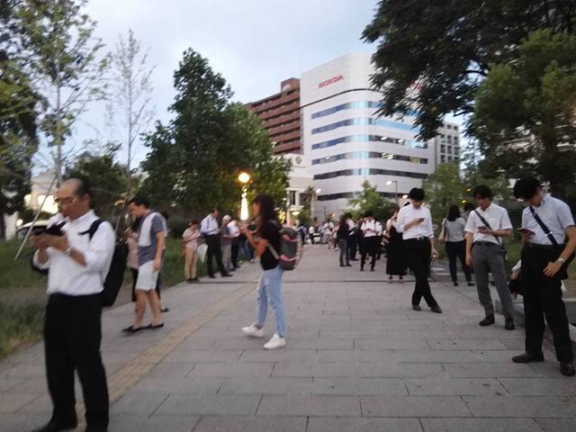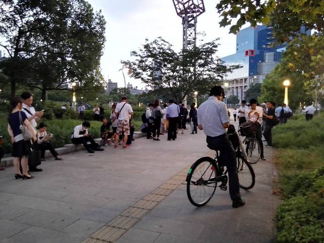 昨天就已经发现了,从地铁站出来就是扇町公园,只见园里到处站满了人,无论男女老少,大家几乎不说话也不走动,一人抱一台手机捉小精灵,那场景用照片感受不到的,真的是颇为诡异。中国广场上是跳广场舞,这里是抓小精灵。