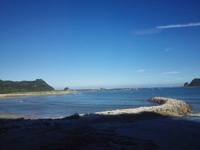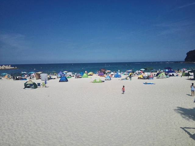 首先是昨天晚上去过的白滨海水浴场。晚上当然什么都看不清,白天才看得真切,海滩不大,沙质比较细腻,关键海浪较大。海滩上比较少见各种商业性的东西,大家都自备各种装备,不过这也的确与海滩较小有关。可惜我们两个,一个没带泳衣,一个不会游泳,所以,就看看算了