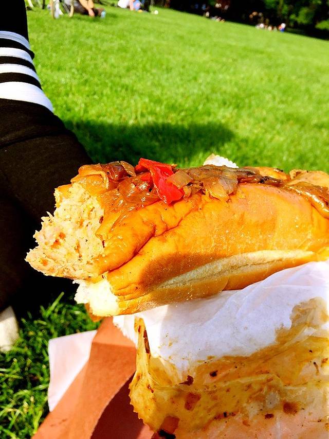 超级大热狗! 小伙伴在美食节上买的!我们看到那条巨大的sausage就吓呆了,闻着那个香~忍不住~ 推荐指数:四颗星 因为等我们转到central park上吃的时候,面包有的硬。肉肉被软软的洋葱和酱汁裹着特别入味。