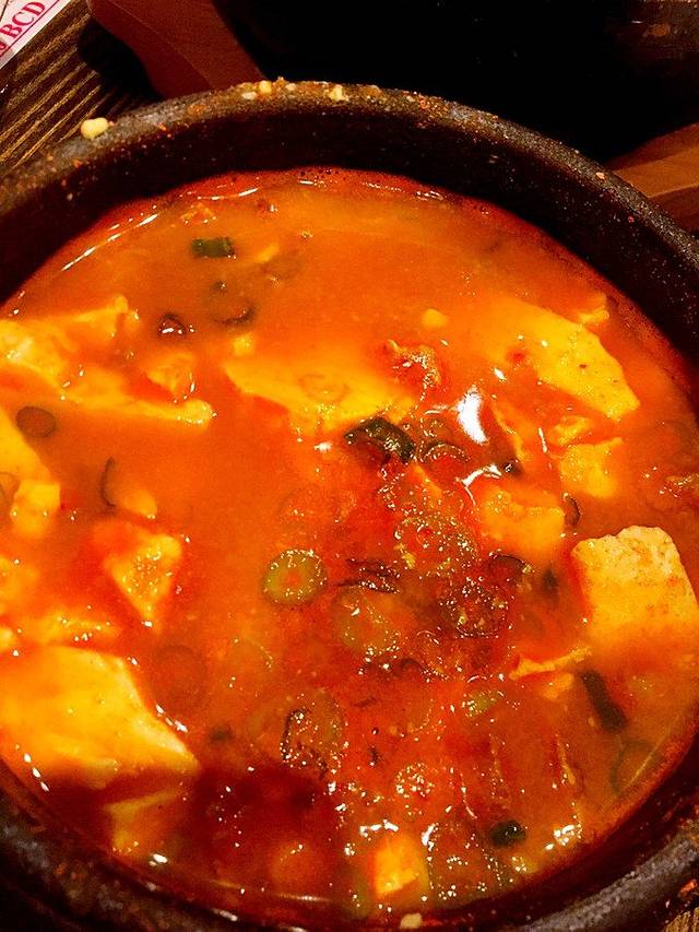 看起来不太美味是么?哈哈。其实很好吃。牛肉豆腐汤。菜单里很多其他口味,比如海鲜,猪肉....还可以选择自己想要的辣度。我们选了regular。但是和辣辣的鱿鱼饭一起吃还是有点辣!不过爽!还有配送的米汤嘛! 吃豆腐的店怎能不吃豆腐呢?!好评!价格也很可爱很合理哦!唯一不足的是当时遇到的服务员态度不是很好呀,跨着脸。