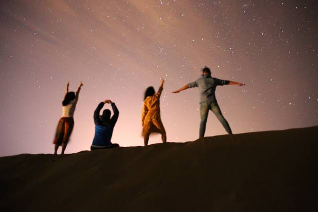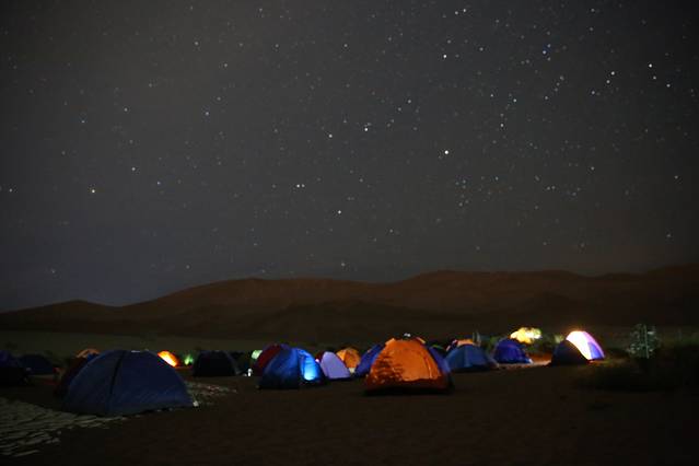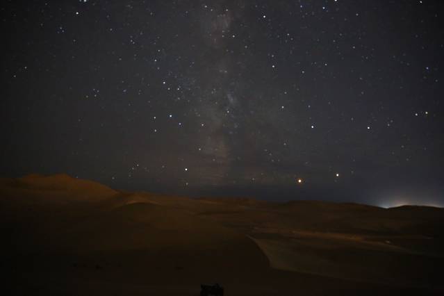 晚上去大漠国际沙漠露营基地露营,本来是在市区集合一起去,但是继昨天的安检事件没有去成后,今天准备去的时候,发现车子出现问题,跟客户沟通了差不多3个小时,才把问题勉强说清楚,然后再去修车,晚上的滑沙和沙漠摩托又没赶上,真实波折,到的时候已经天黑,大家一起吃了火锅,老板看我们什么都没玩上,就带我们去沙坡顶上看银河,真的很美。第二天还安排了沙漠摩托给我们玩,天气好的话,早上可以看到日出,就在露营的地方走出来就能看到。老板人超级好,建议要体验的人可以去这件,通过驼峰客栈,预定的大漠国际沙漠露营基地。