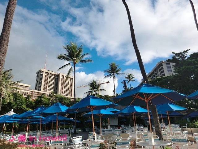 一早,一行四人溜达出来熟悉四周环境,早晨都是拍拍拍的时间~毕竟要在这里住个几天,了解环境才是上策。下榻酒店就在Hilton vilage对面,离威基基海滩附近,走几分钟就是海边,先在靠近海边的酒店一层,露天吃个早餐好啦~不算正经餐食,光四杯鲜榨菠萝汁就要了20刀~~~感觉肉疼,不续杯。四人一顿早餐下来花了120多刀也是醉醉的,不过几片培根酸奶和煎蛋尔尔,主要是花卷的公主病犯了,一定要在海边的阳伞下喝著鲜榨果汁。